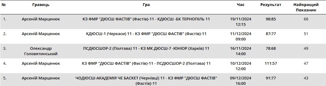 В зіграних матчах 13-річний форвард команди КЗ ФМР ДЮСШ Фастів Арсеній Марценюк провів потужний тур, оформивши два дабл-дабли і в середньому набираючи 47.0 очка, 15.0 підбирання, 2.3 передачі за три матчі.