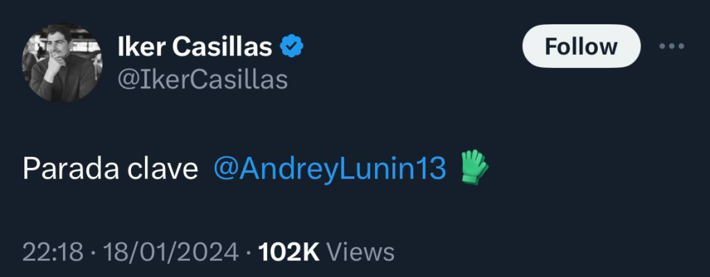 Тим часом, легенда Реала Ікер Касільяс розхвалює Луніна у своєму Twitter.