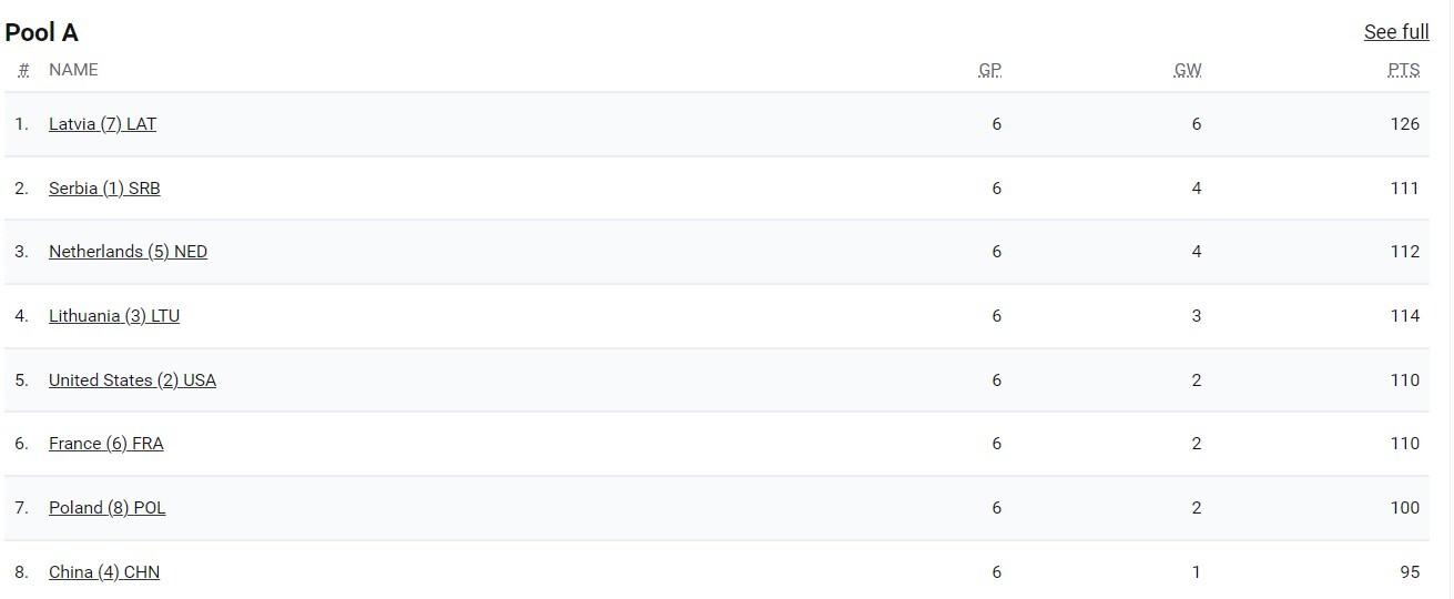 У чоловіків єдиною збірною, яка продовжує залишатись без поразок – є діючий олімпійський чемпіон збірна Латвії. Латвійці вже гарантували собі місце в півфіналі.