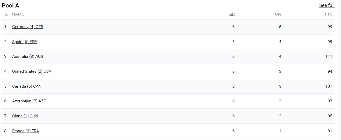 У жінок після шести зіграних матчів лідирує Німеччина, на одну перемогу менше у Іспанії та Австралії, далі США та Канада, а ось Франція має лише одну перемогу і ризикує завершити боротьбу за медалі вже після групового етапу.