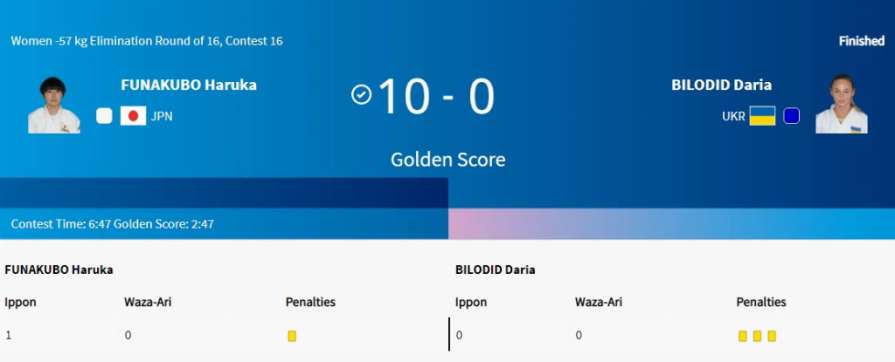 Дар’я поступилася японці Харуку Фунакубо. Українка отримала 3 шидо та заробила дискваліфікацію у додатковий час.