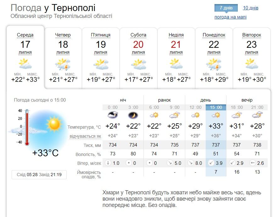 Південь, східні області та значна частина центру ще затримаються серед надзвичайної спеки, проте вже впродовж 19, 20 та 21 липня й тут спека послабне. Поступово, поступово!! температура повітря знизиться до +30+34 градусів.