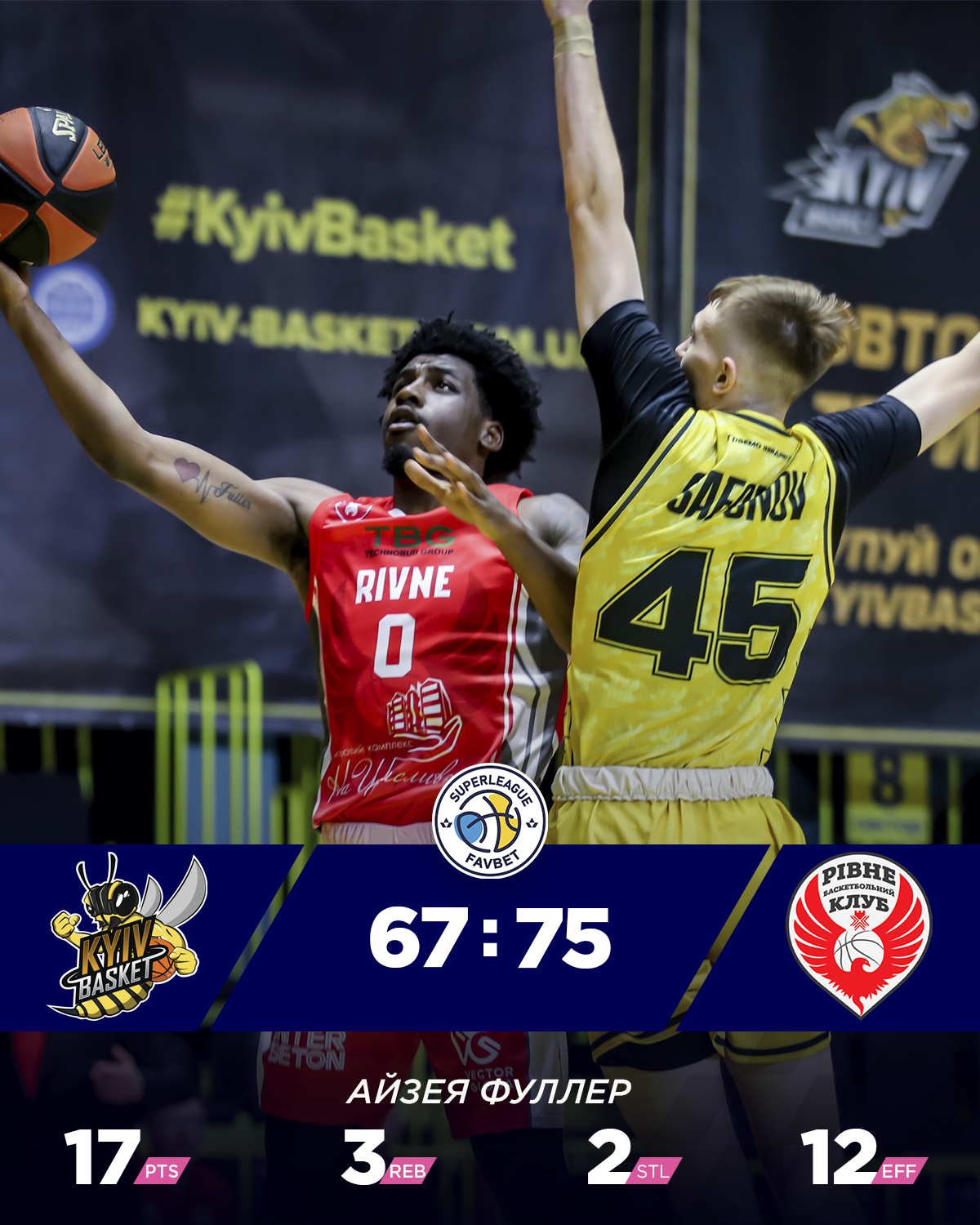Найрезультативнішим у переможців став Айзея Фуллер з 17 очками, у Київ-Баскета функцію набирання очок в цій грі взяли на себе Павло Буренко (23 очка, 5/9 триочкових) та Денис Клевзуник (22 очка та 10 підбирань).