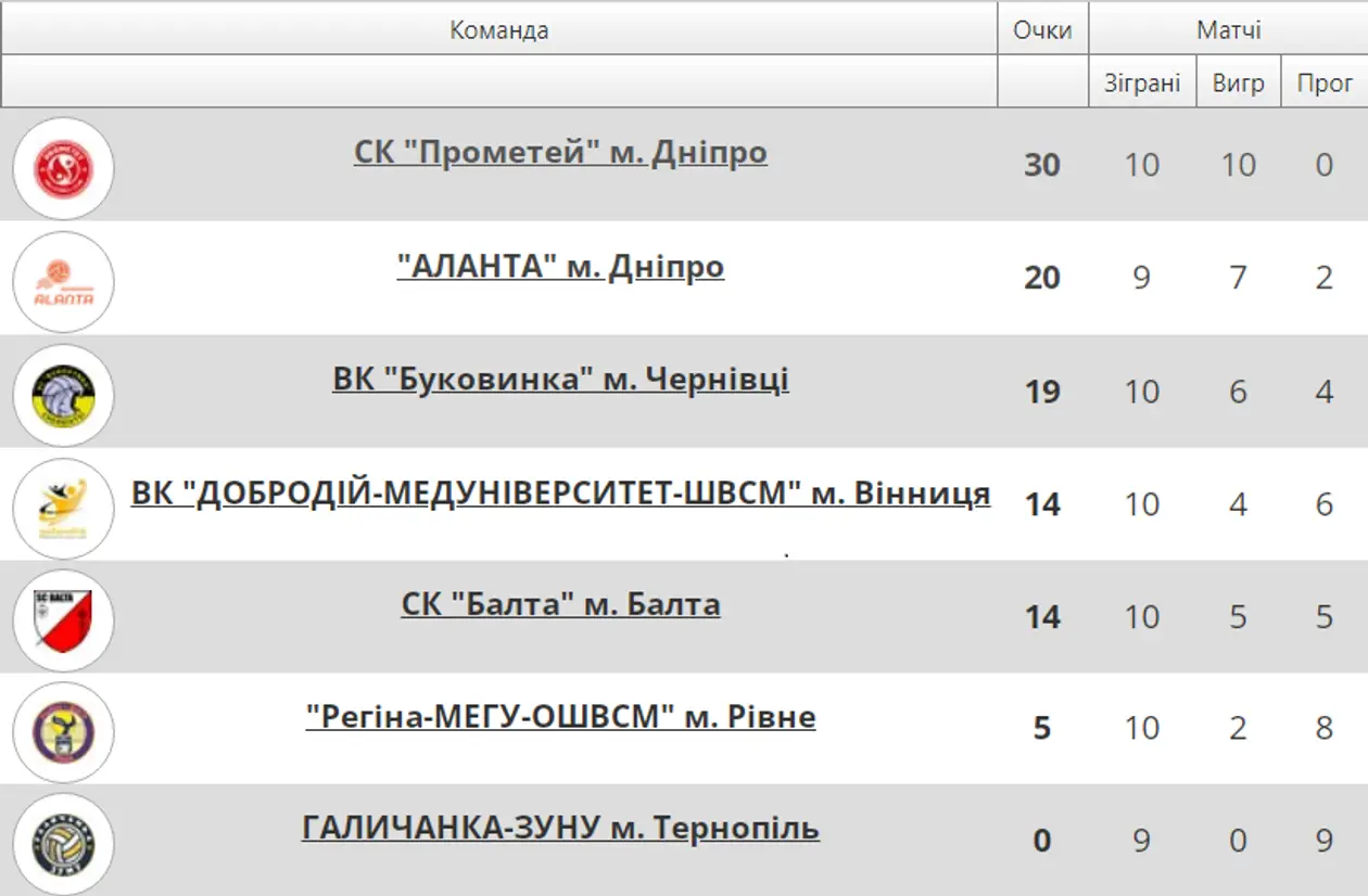 Як бачимо, Прометей тут поза конкуренцією. Вони суттєво посилили склад перед ЛЧ (ідуть там 1-3, обігравши румунок і лише на тай-брейку поступившися полячкам) і реальних конкурентів на внутрішній арені не мають. Не програли жодної партії.