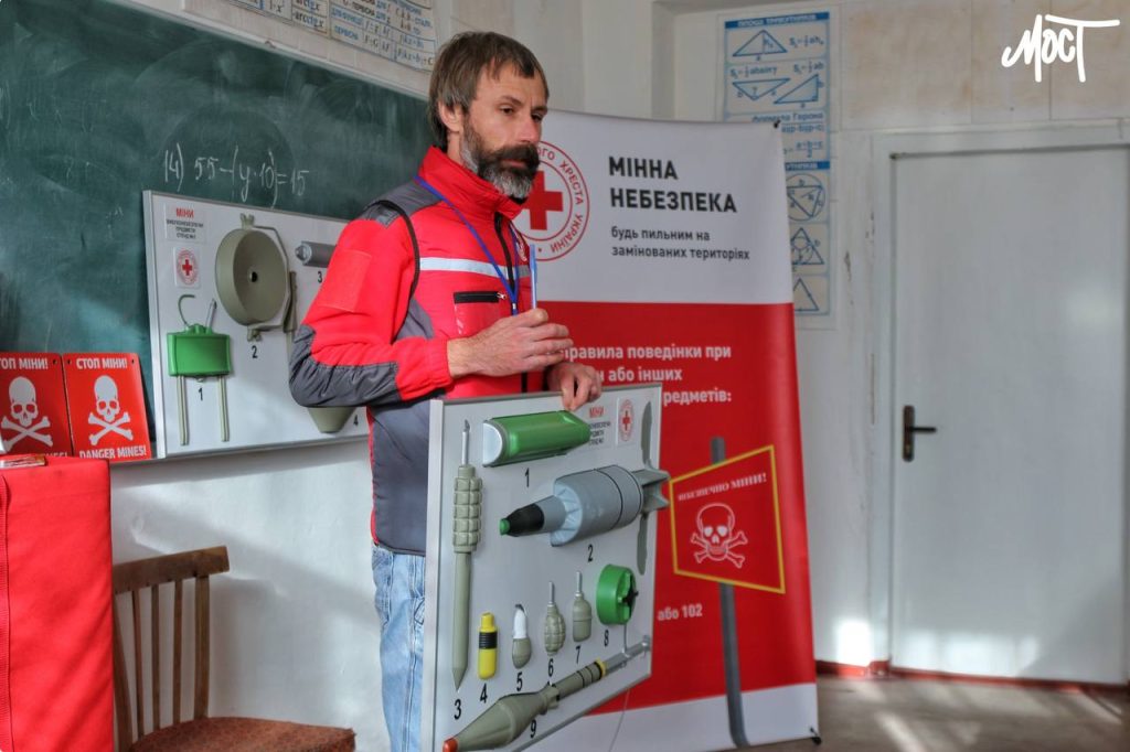 Фахівець Червоного Хреста Антон Колосов під час занять з мінної безпеки у школі села Борозенське.