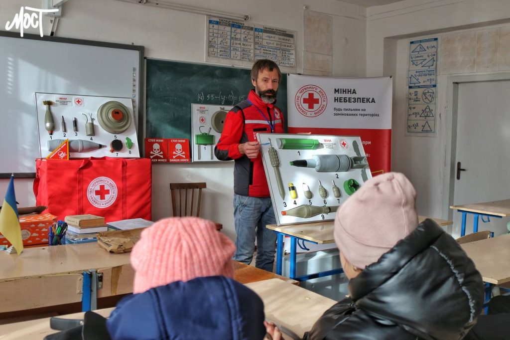 Фахівець Червоного Хреста Олександр Прокопчук розповідає школярам з села Борозенське про мінну безпеку.