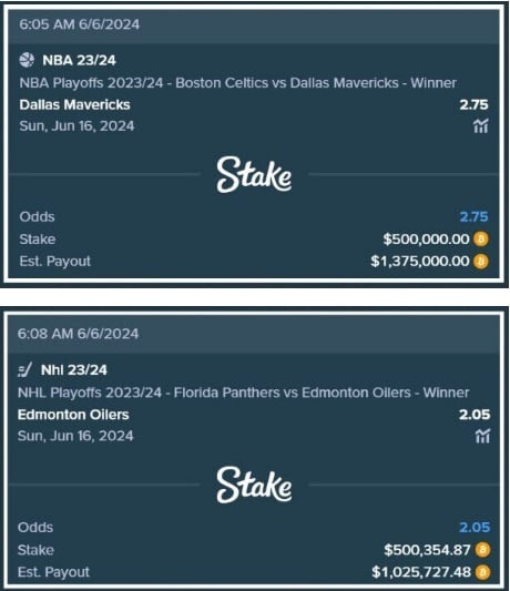 Цього разу він поставив 500,000 доларів на перемогу Далласа у фіналі Національної баскетбольної асоціації (НБА) та Едмонтон Ойлерз у фіналі Національної хокейної ліги (НХЛ).