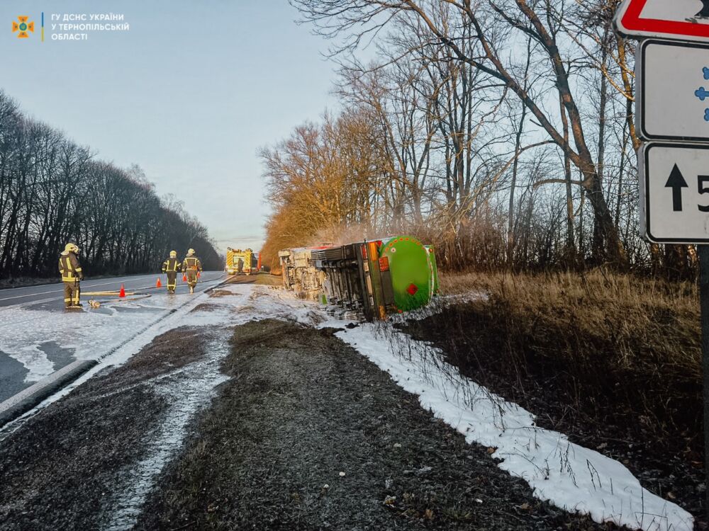 За попередньою інформацією, на слизькій дорозі водій бензовоза втратив контроль за керуванням. Автомобіль з’їхав на узбіччя та перекинувся. На щастя, внаслідок ДТП потерпілих немає, але з люків цистерни відбувся незначний витік пального.
