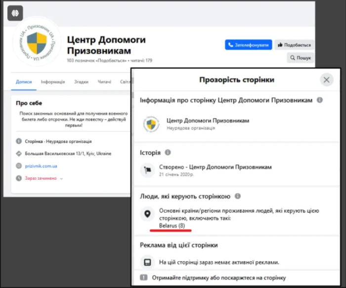 Щодо «Центру допомоги призовникам», який вказаний у «шапці» флаєра, то такої організації із зазначеним номером телефону у відкритих реєстрах немає. Є лише сторінка у Фейсбуці з ідентичною назвою. Востаннє дописи на ній датуються ще до початку повномасштабного вторгнення – 17 лютого 2022 року. Судячи із дописів, засновники сторінки надавали консультації щодо отримання відстрочки від строкової служби в армії. Дописи містять помилки, русизми, в серед її адміністраторів – акаунти, зареєстровані у Білорусі.