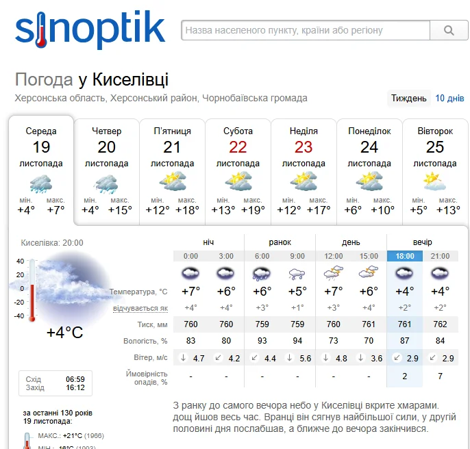 Погода в Киселівці за 19 листопада 2025 року. Джерело: сайт “Синоптик”.