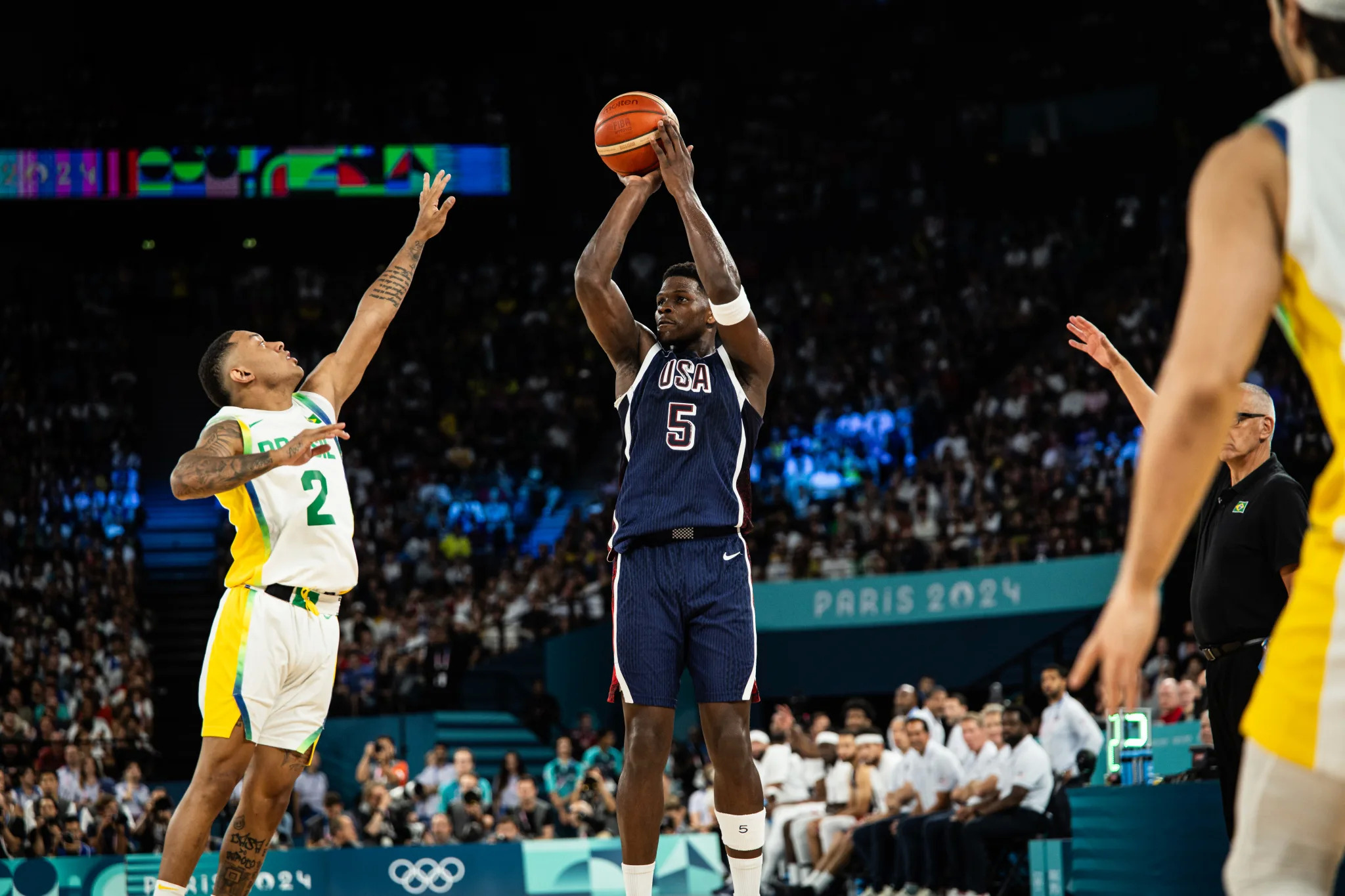 Збірна США оформила впевнену перемогу в матчі 1/4 фіналу Олімпійських ігор, здолавши команду Бразилії з рахунком 122:87. Найрезультативнішим у складі американської збірної став Девін Букер, який за 16 хвилин набрав 18 очок, реалізувавши 5 з 7 триочкових. У складі збірної Бразилії 30 очок та 6 підбирань до активу записав центровий Бруно Кабокло.