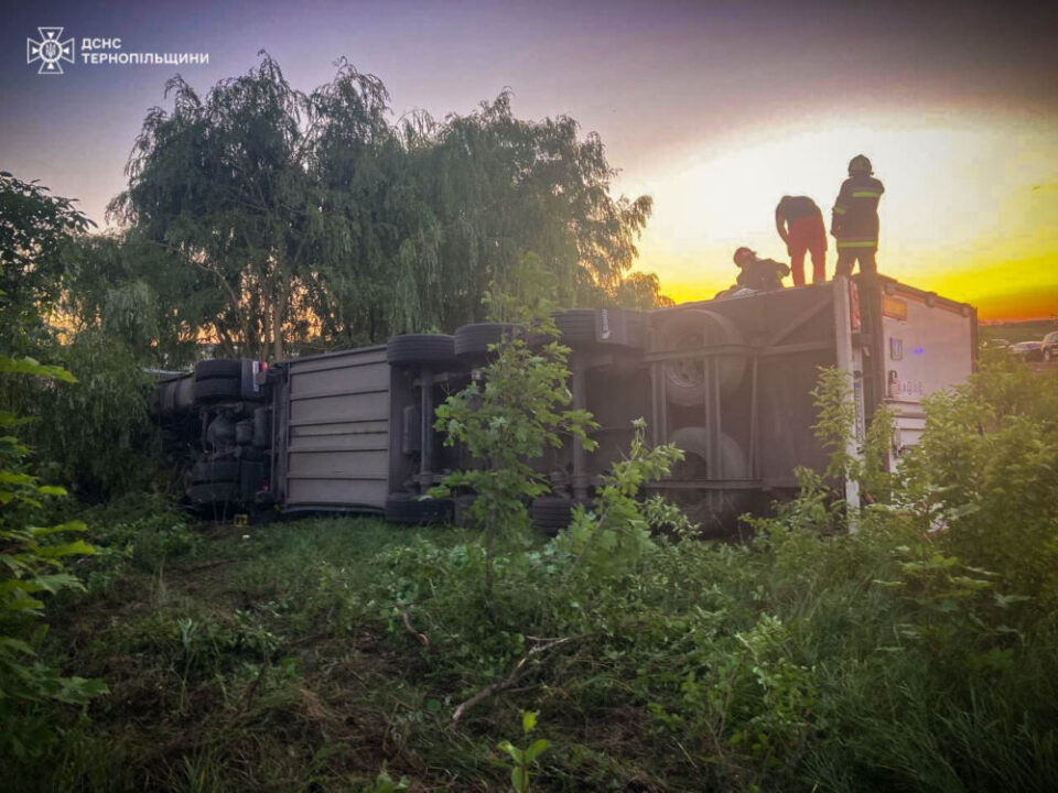 У Зборові, що на Тернопільщині, сталась дорожньо-транспортна подія. Вантажний автомобіль з причепом контейнерного типу перекинувся з узбіччя дороги. Про це інформують у ГУ ДСНС України у Тернопільській області.