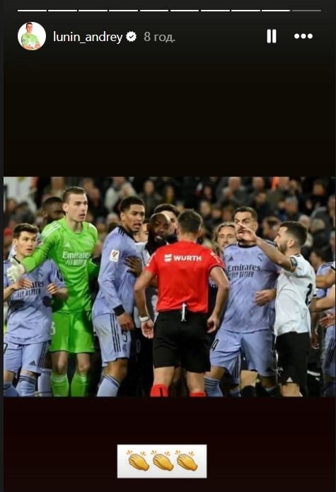 Одним з найактивніших був Лунін. І рефері виписав у його бік червону картку. Та, насправді, там перебувало стільки футболістів, що було важко зрозуміти, кого саме вилучив Мансано. Тільки пізніше стало зрозуміло, що це був не Лунін, а Беллінгем.
