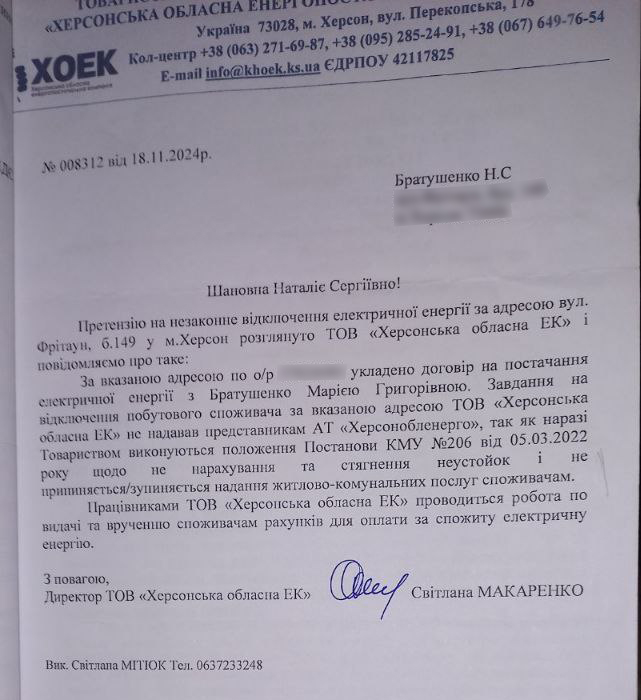 Втім компанія «Херсонобленерго» все ж надала Наталії Братушенко пояснення щодо відключення.