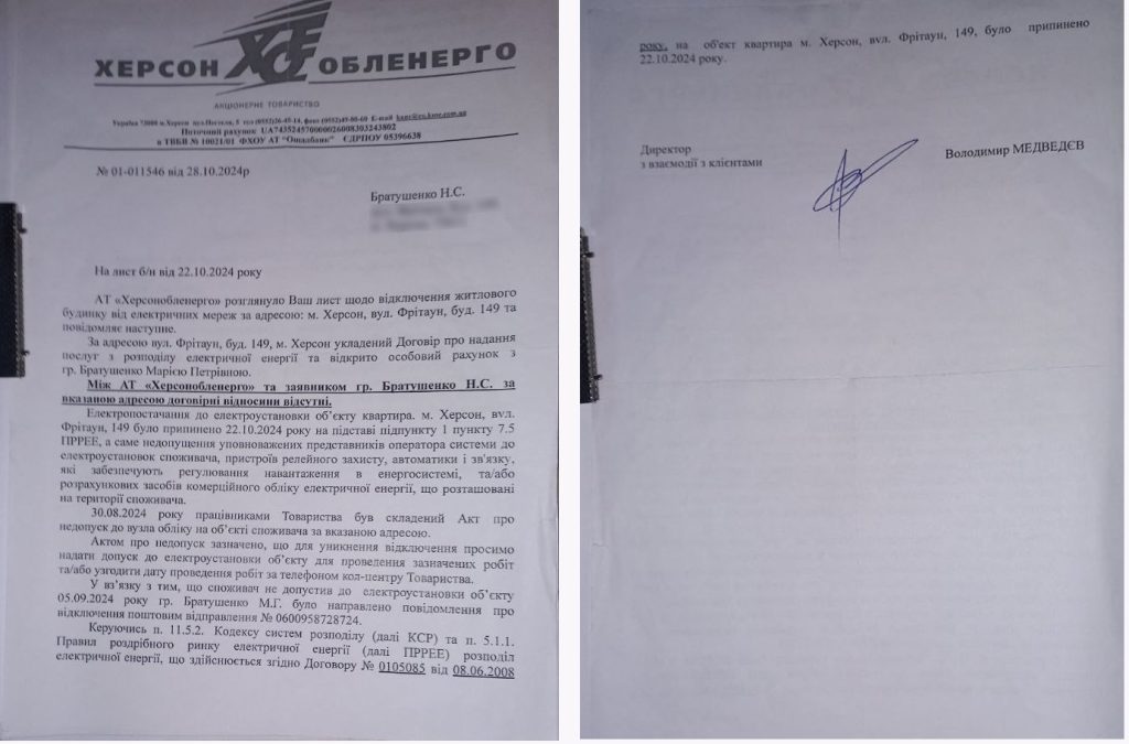 «Спочатку, – каже жінка, – мені надали адвокатку від держави на безоплатній основі. Але ця адвокатка нічим не допомогла мені. Більше того, з’ясувалося, що вона без узгодження зі мною домовлялася про щось з представниками «Херсонобленерго». Тому я відмовилася від її послуг, зараз мої інтереси представляє інша людина. Зараз ми намагаємося добитися від енергокомпанії надання, окрім акту від 30 серпня 2024 року, якихось інших документів, на підставі яких були відключені від електрики два будинки».