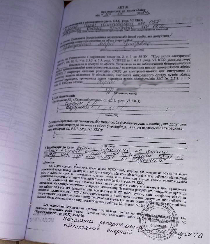Саме так. У написаному вище немає помилки у датах. Працівники «Херсонобленерго» склали акт про те, що мати Наталії Братушенко, яка жила у тому ж подвір’ї, але в іншому будинку, відмовила працівникам енергокомпанії у доступу до лічильника. Підписаний акт двома співробітниками акціонерного товариства (АТ) «Херсонобленерго» і начальником департаменту клієнтських операцій компанії Бєлугіним І. О.