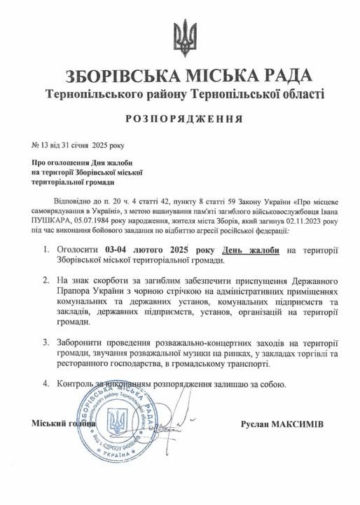 У Зборівській громаді оголосили День жалоби через загибель Пушкара Івана Петровича. Про це повідомив на фейсбук-сторінці голова Зборівської міської ради Руслан Максимів.