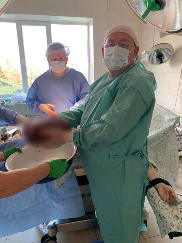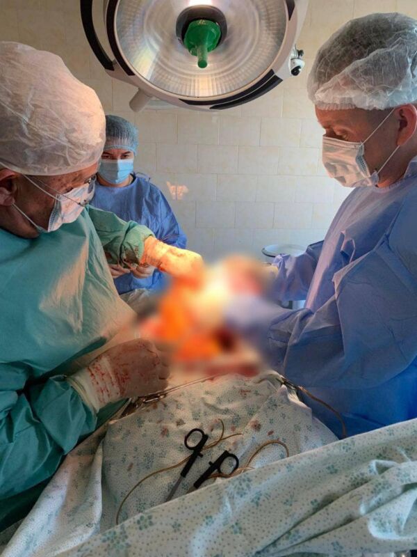 Повідомляється, що пацієнтці провели екстирпацію матки з додатками, оментектомію, цитодіагностику (рак лівого яєчника). Операцію виконано в радикальному обʼємі. Загальна маса пухлини становить 9.5 кг.