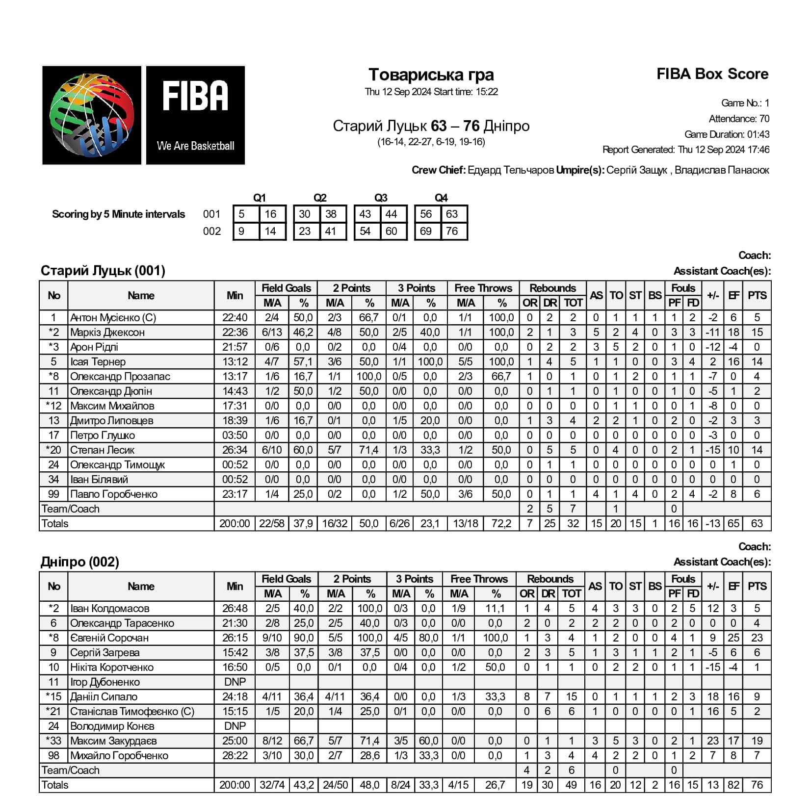Дніпро: Сорочан 23 + 4 підбирання, Закурдаєв 19 + 3 перехоплення – 5 втрат, Сипало 9 + 15 підбирань, Колдомасов 5 + 5 підбирань + 4 передачі + 3 перехоплення – 3 втрати, Тимофеєнко 2 + 6 підбирань — старт, Михайло Горобченко 7 + 4 передачі + 4 підбирання, Загреба 6 + 5 підбирань – 3 втрати, Тарасенко 4, Коротченко 1