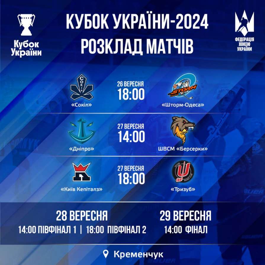 В четвер 26 вересня у Кременчуці стартує Кубок України з хокею, в якому беруть участь сім клубів: Сокіл (Київ), ХК Кременчук, Київ Кепіталз, Дніпро (Херсон), Берсерки (Вінниця), Тризуб (Київ) та Шторм (Одеса).