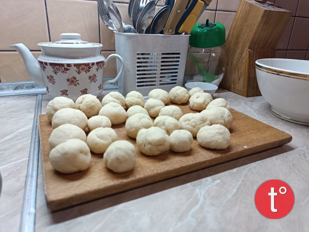 Тепер потрібно замісити тісто. Поступово додавайте борошно, замішуючи доти, доки воно не стане еластичним та не буде сильно липнути до рук. Готове тісто має бути м’яким та слухняним. Розділіть тісто на дві частини. З кожної частини сформуйте ковбаску, яку потім наріжте на невеликі шматочки. З них сформуйте круглі кульки – майбутні пончики.