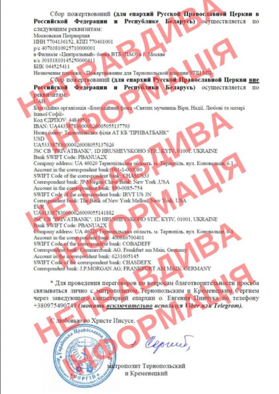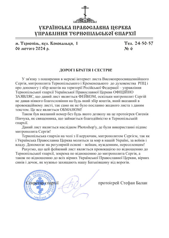 “У зв’язку з поширення в мережі інтернет листа Високопреосвященнійшого Сергія, митрополита Тернопільського і Кременецького до духовенства РПЦ про допомогу і збір коштів на території Російської Федерації – управління Тернопільської єпархії Української Православної Церкви ОФІЦІЙНО ЗАЯВЛЯЄ, що даний лист являється ФЕЙКОМ, оскільки митрополит Сергій не давав ніякого благословіння на будь-який збір коштів, який вказаний в провокаційному листі, так само як не було надіслано жодного листа з даним текстом. Це все являється ОБМАНОМ!