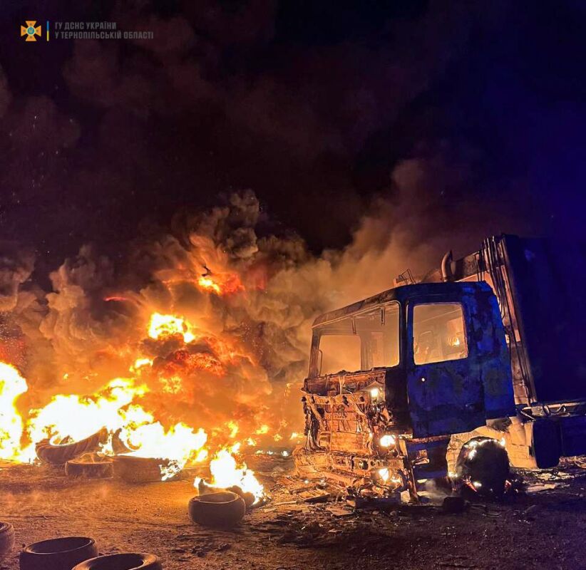Масштабна пожежа сталася у ніч з 29 на 30 грудня. У селі неподалік Тернополя згорів сміттєвоз, завантажений шинами, – повідомляють у 3 ДПРЗ ГУ ДСНС України у Тернопільській області.