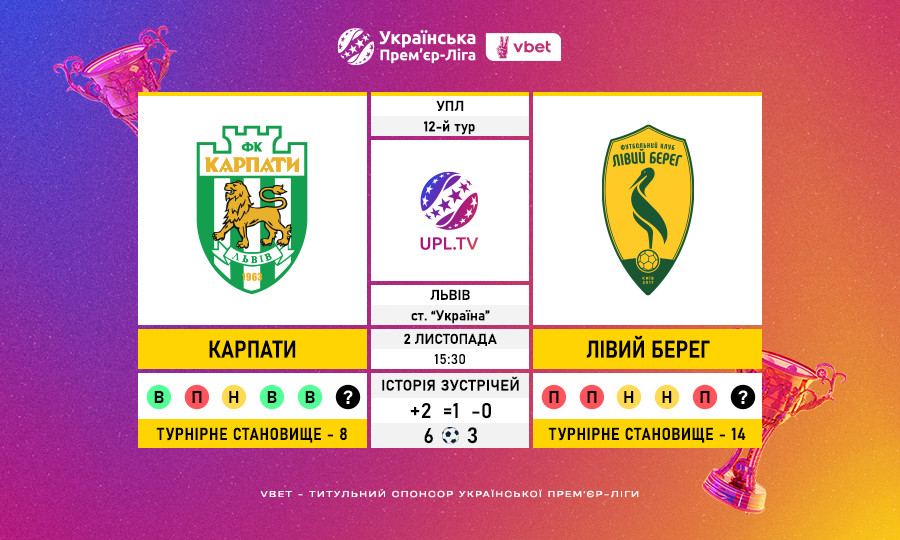 Матч 12-го туру VBET Української Прем’єр-Ліги «Карпати» — «Лівий Берег»: статистичне прев’ю
