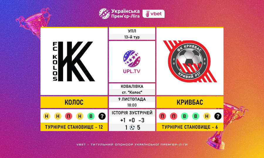 Матч 13-го туру VBET Української Прем’єр-Ліги «Колос» — «Кривбас»: статистичне прев’ю