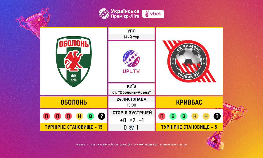Матч 14-го туру VBET Української Прем’єр-Ліги «Оболонь» — «Кривбас»: статистичне прев’ю