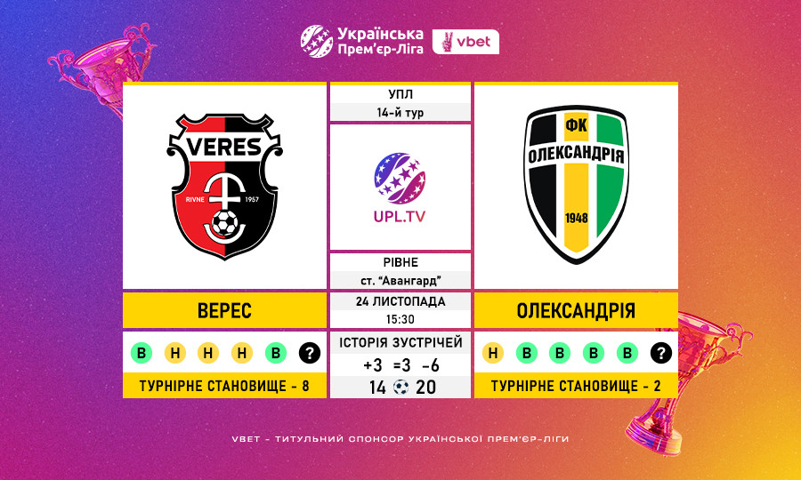 Матч 14-го туру VBET Української Прем’єр-Ліги «Верес» — «Олександрія»: статистичне прев’ю