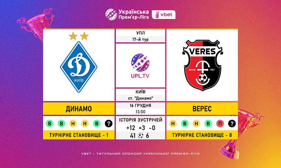 Матч 17-го туру VBET Української Прем’єр-Ліги «Динамо» — «Верес»: статистичне прев’ю