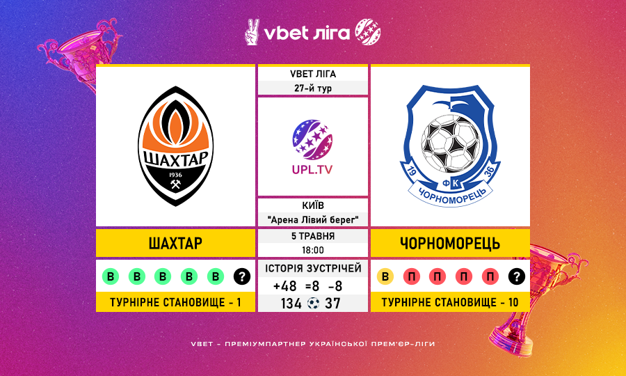 Матч 27-го туру VBET Ліги «Шахтар» — «Чорноморець»: статистичне прев’ю