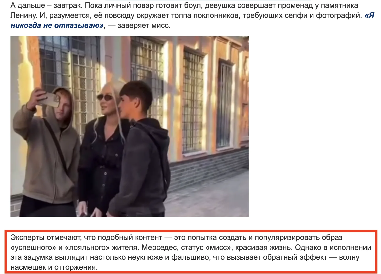 Але попри старання Катерини Поповчук, її стиль життя та контент не оцінили навіть місцеві пропагандисти, розкритикувавши те саме відео ранкової рутини самопроголошеної Міс.