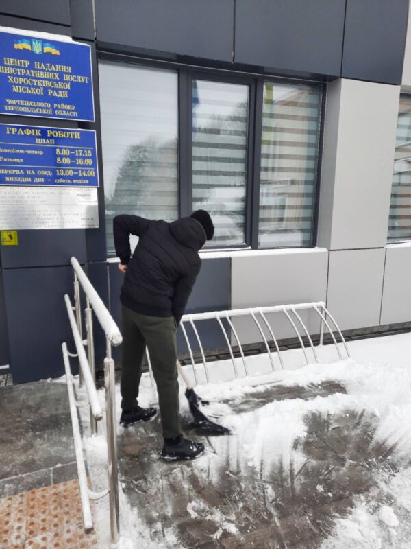 Попри свій вихідний, Гладун розчищав сніг біля приміщення міської ради і закликав інших робити так само.