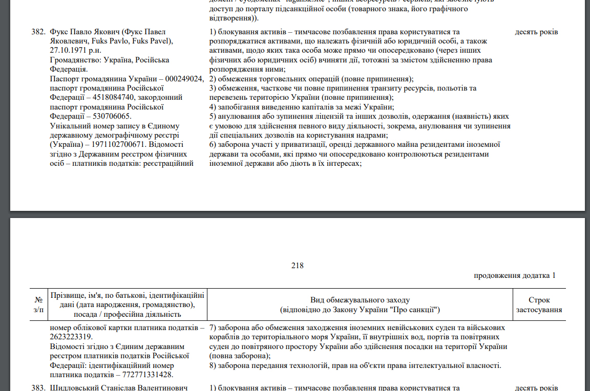 У червні 2024 року Володимир Зеленський ввів рішення РНБО про застосування санкцій. Зокрема, низка санкцій та обмежувальних заходів на десять років були введені проти Павла Фукса (перед цим санкції проти нього були введені у 2021 році). У документі вказано, що він має два громадянства: України та росії (див. також нижче скрін).