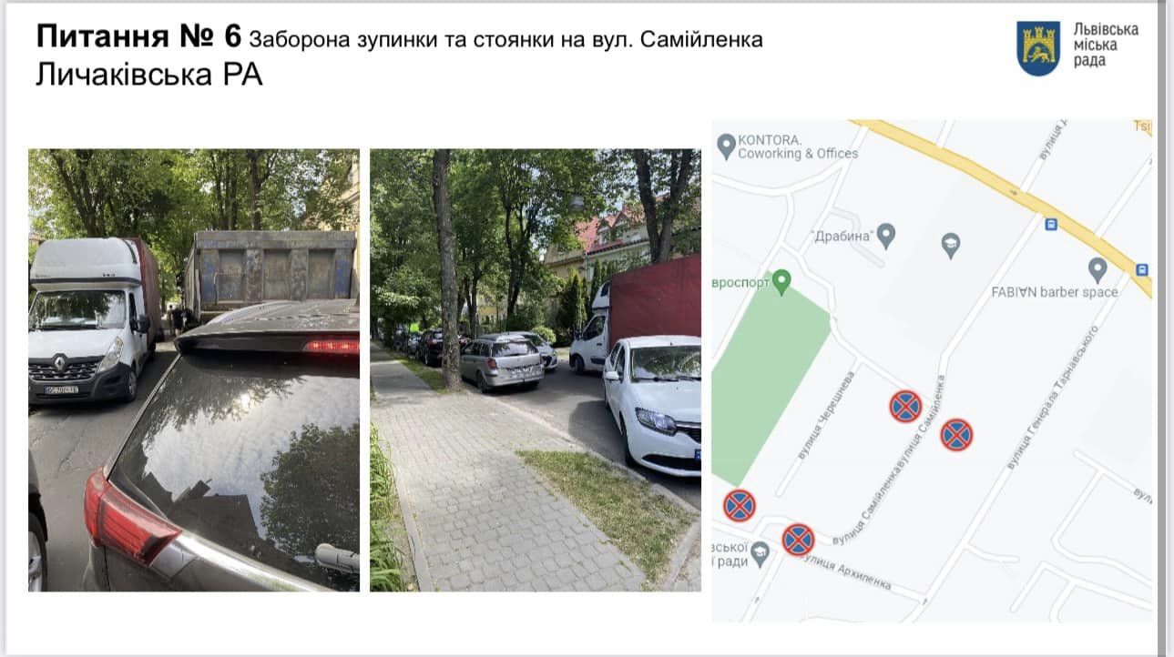 Мешканці вулиці Самійленка звернулися з проханням заборонити зупинку і стоянку на цій вулиці. Відповідне рішення у четвер, 27 липня, підтримала Львівська комісія з безпеки дорожнього руху.