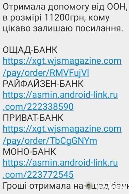 Поліцейські вкотре звертаються до жителів області бути уважними. Вся інформація про отримання допомоги від міжнародних донорів публікується виключно на офіційних сайтах державних органів та міжнародних організацій. Не довіряйте оголошенням в соцмережах та месенджерах. Не переходьте за сумнівними посиланнями. Не вводьте реквізити та конфіденційні дані платіжних карток на незнайомих та підозрілих веб-сайтах.