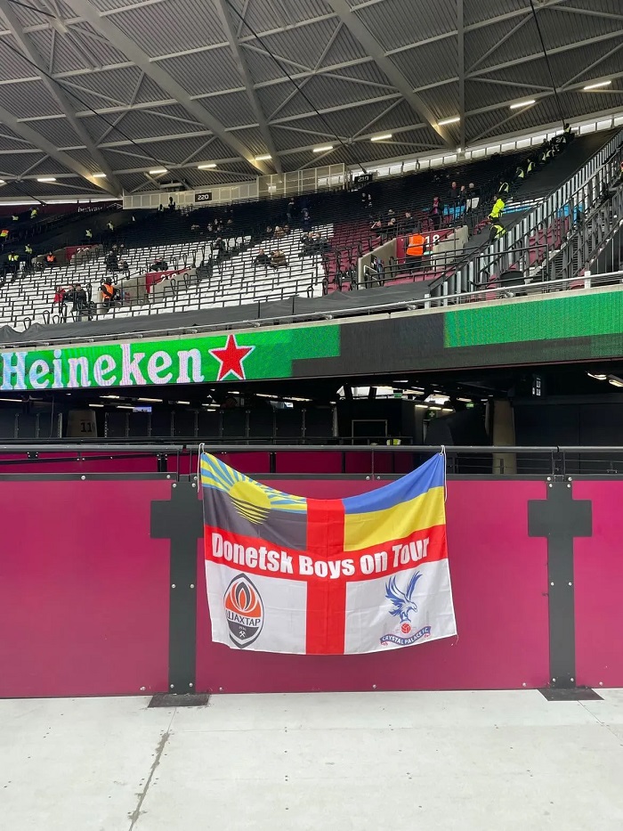На флаге, который болельщик хотел пронести на арену, основа состояла из флага Англии. По его углам расположены были украинский флаг, эмблема ФК «Шахтер» (Донецк) и флаг Донецкой области. То есть флаг был не только в сине-желтым.