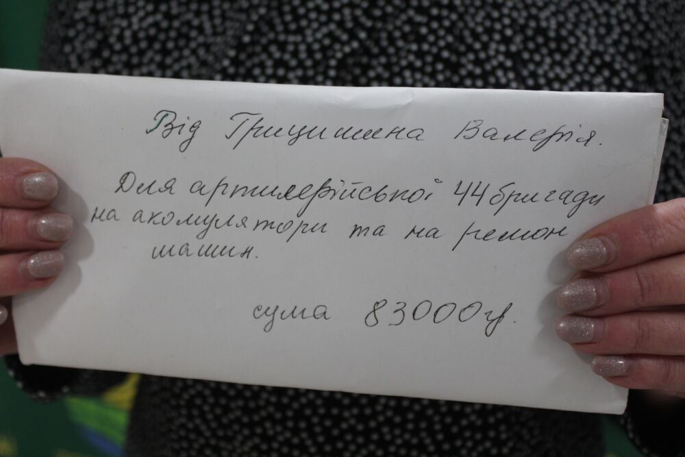 “83 тисячі гривень передав житель Великих Гаїв Valerii Hrytsyshyn, який зараз мешкає у Лондоні, для воїнів 44 окрема артилерійська бригада імені гетьмана Данила Апостола.