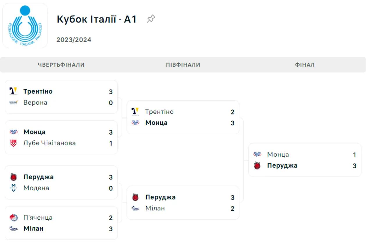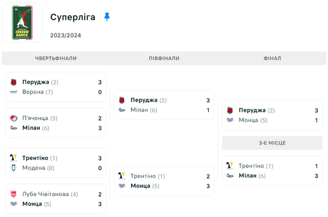 У матчах на виліт у півфіналі вже остаточно помстилися Мілану, а в фіналі обіграли сенсаційну Монцу, яка знову вибила Трентіно. Можливо, дещо пощастило, що уникнули зустрічей з Лубе та Трентіно. Але це вже точно не проблеми Перуджи. Та й Італія настільки конкурентна, що тут кожен може зачепитися з кожним. Є титул чемпіона ітаоійської Суперліги! 4/4!