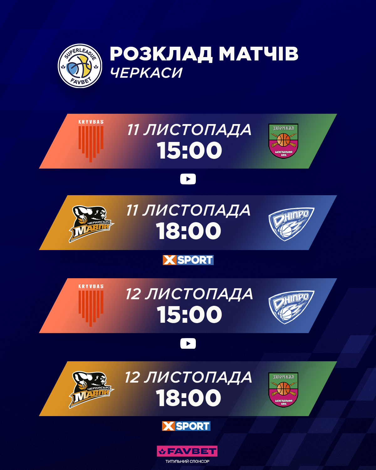 18:00 Черкаські Мавпи – Запоріжжя (XSPORT, YouTube ФБУ)