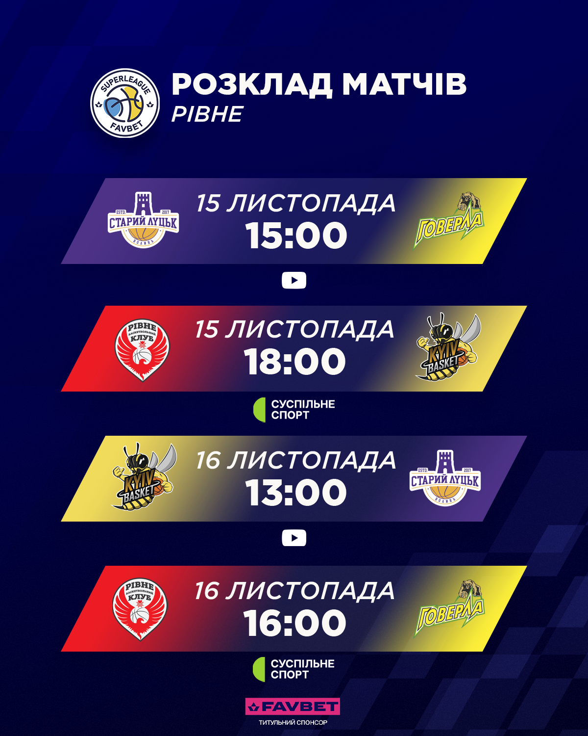 18:00 Рівне – Київ-Баскет (Суспільне, YouTube ФБУ)