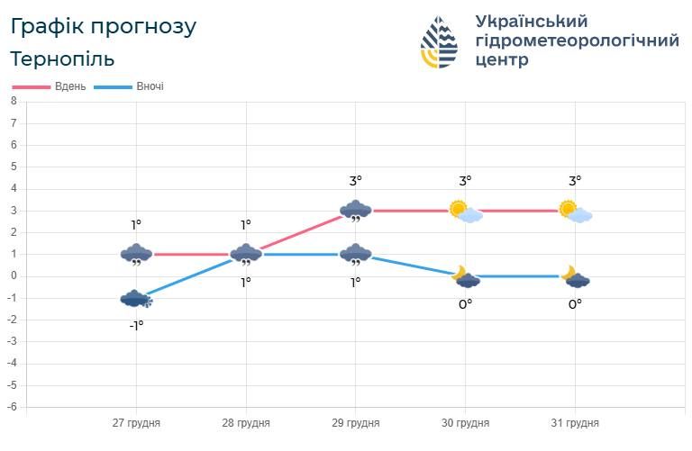 Тернопільський обласний центр з гідрометеорології повідомляє, що 30 грудня також буде хмарно з проясненнями, без істотних опадів. Температура коливатиметься від -3° до +2°.