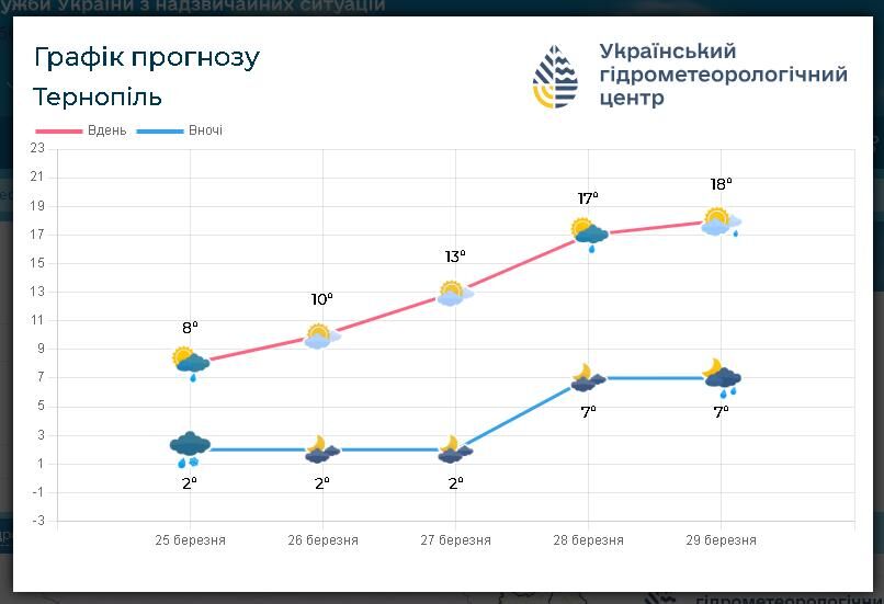 26 березня: Хмарно з проясненнями. Без опадів. Вночі та вранці на дорогах ожеледиця, слабкий туман. Вітер південно-західний, 5 – 10 м/с. Температура по області вночі від 2° морозу до 3° тепла, вдень 8 – 13° тепла; по м. Тернополю вночі від 1° морозу до 1° тепла, вдень 10 – 12° тепла.