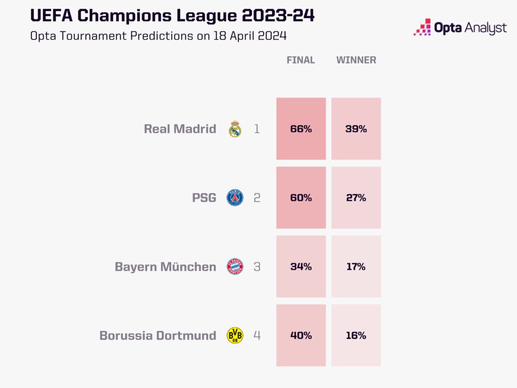 Суперкомпьютер Opta обновил свой прогноз касательно победителя Лиги чемпионов сезона 2023/24. Сейчас явным фаворитом на получение чемпионского титула является мадридский «Реал», за который играет Андрей Лунин.