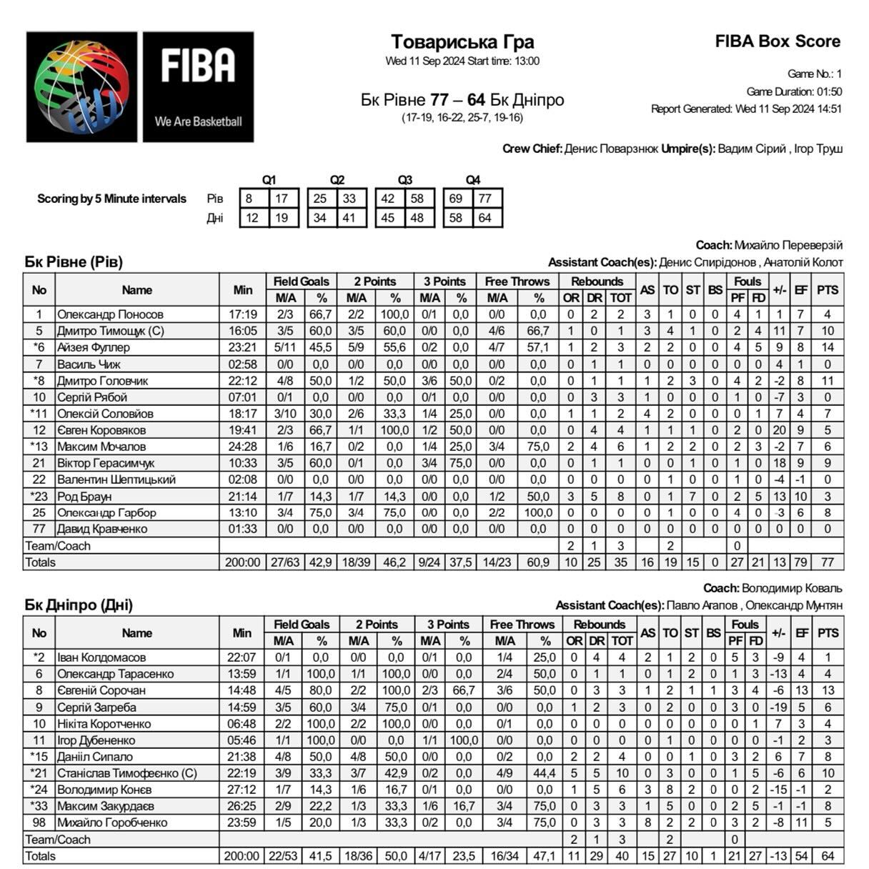 Рівне: Фуллер 14, Головчик 11 + 3 перехоплення, Соловйов 7 + 4 передачі, Мочалов 6 + 6 підбирань, Браун 3 + 8 підбирань + 7 перехоплень — старт, Тимощук 10 + 3 передачі – 4 втрати, Герасимчук 9, Гарбар 8, Коров’яков 5 + 4 підбирання, Поносов 4 + 3 передачі, Чиж 0, Рябой 0, Шептицький 0, Кравченко 0