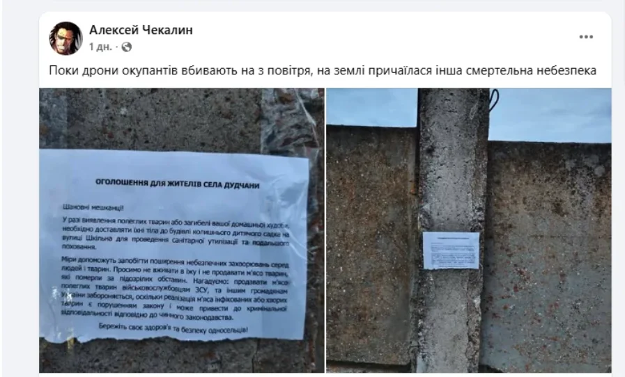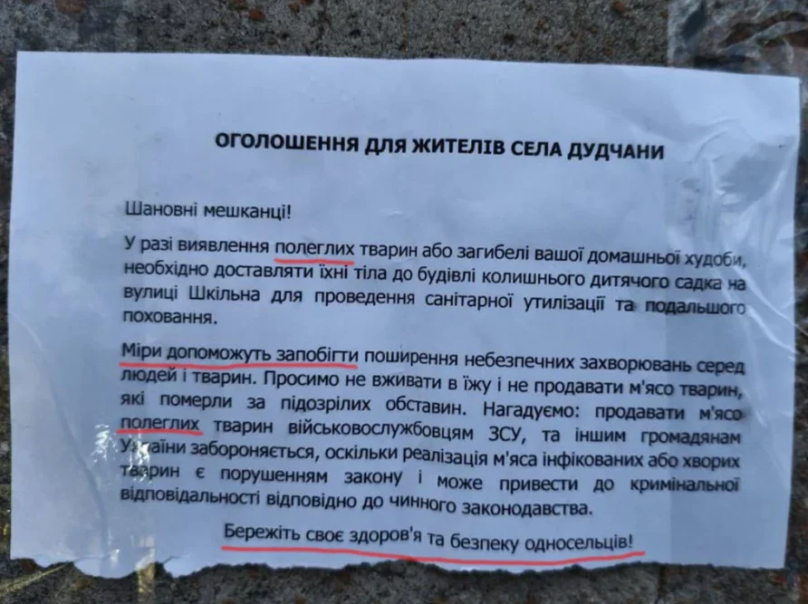 Як доказ своїм словам пропагандисти виклали фото, які нібито були зроблені в населеному пункті Дудчани Бериславського району. На них зображені оголошення, що закликають місцеве населення зносити трупи тварин у відведене місце для подальшого поховання. Для створення ілюзії правдивості своїх повідомлень росіяни оприлюднили ці знімки в одній з бериславських спільнот у соцмережі Facebook.