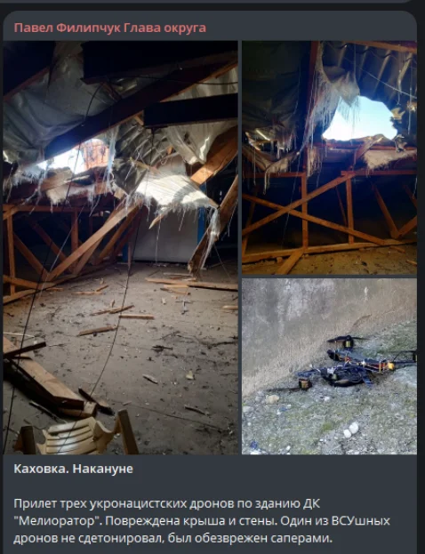 Однак уважні користувачі швидко помітили: саме ці ж фото на день раніше виклав у себе в Telegram-каналі гауляйтер Каховки Павло Філіпчук. У своєму дописі він зазначав, що на знімках — каховський кінотеатр, пошкоджений ударом дрона, і що жодних постраждалих немає.
