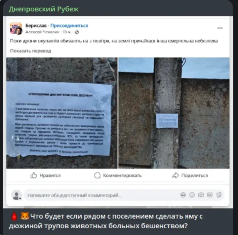 Фейкові фотодокази епідемії сказу на правобережжі Пост у спільноті “Берислав”.